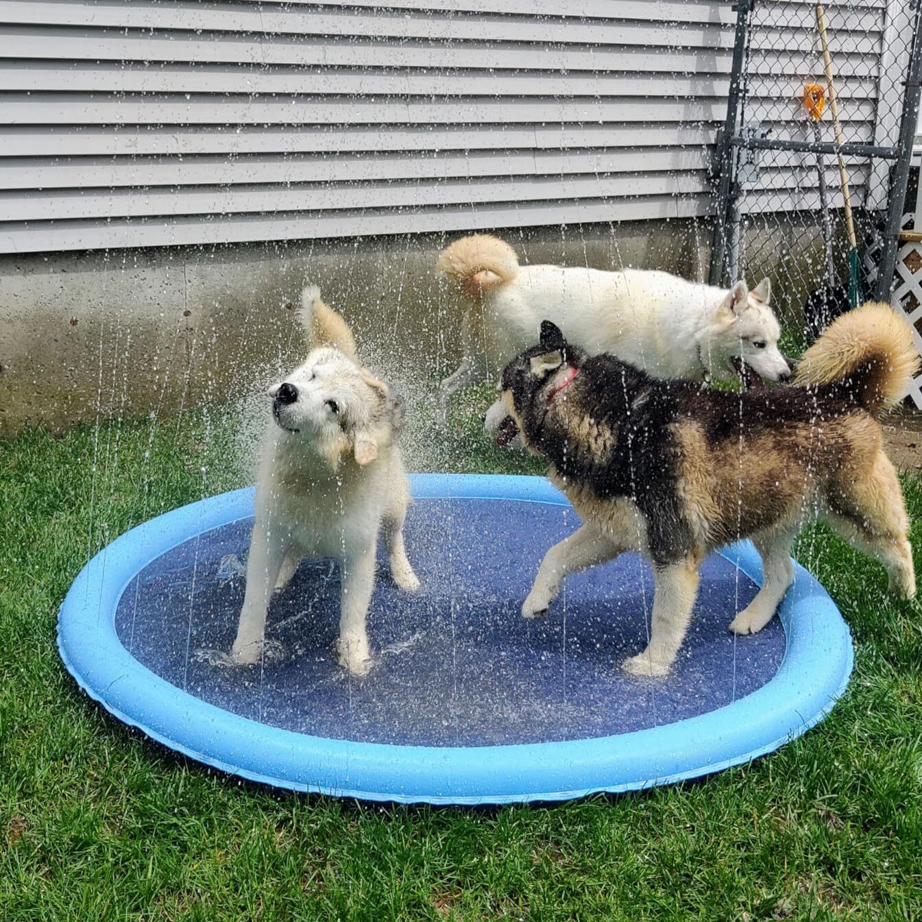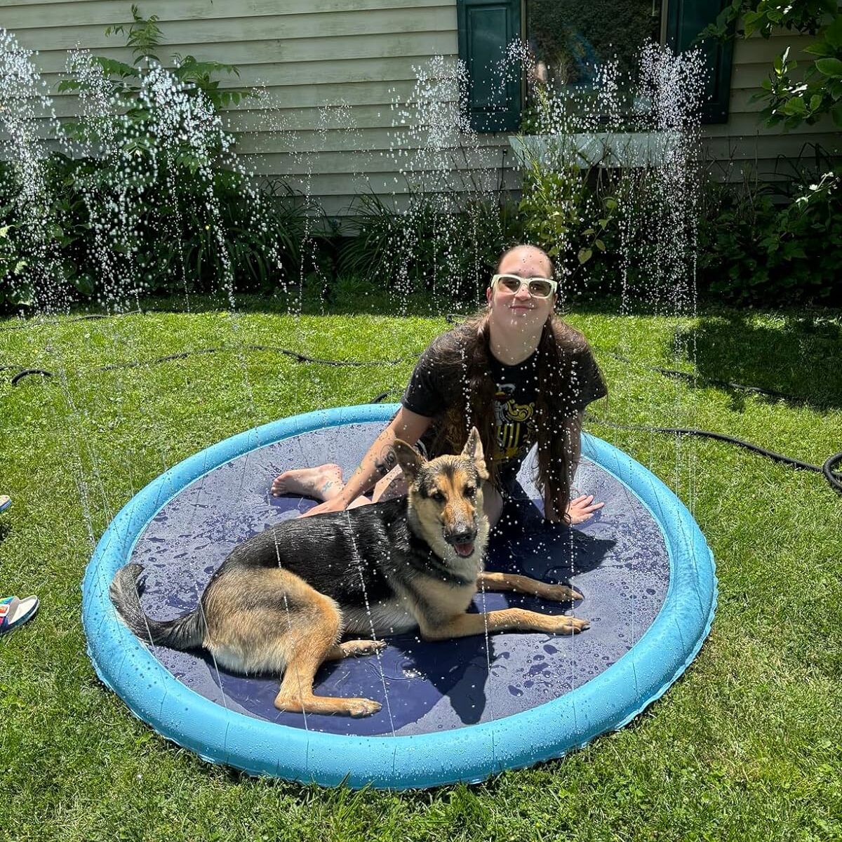 "I was scared to buy one of these for my dogs since I heard their nails can pop it, it doesn’t hold up, the water doesn’t shoot very high, etc. None of that is true. We have used this pad over a dozen times and it’s still basically brand new. Strong material, and it’s huge!! It actually pools water quite a bit in the center, so it’s great to lay in. Even when my hose isn’t turned all the way one, it’s sprays 5-6 ft in the air. Great fun, just buy it"